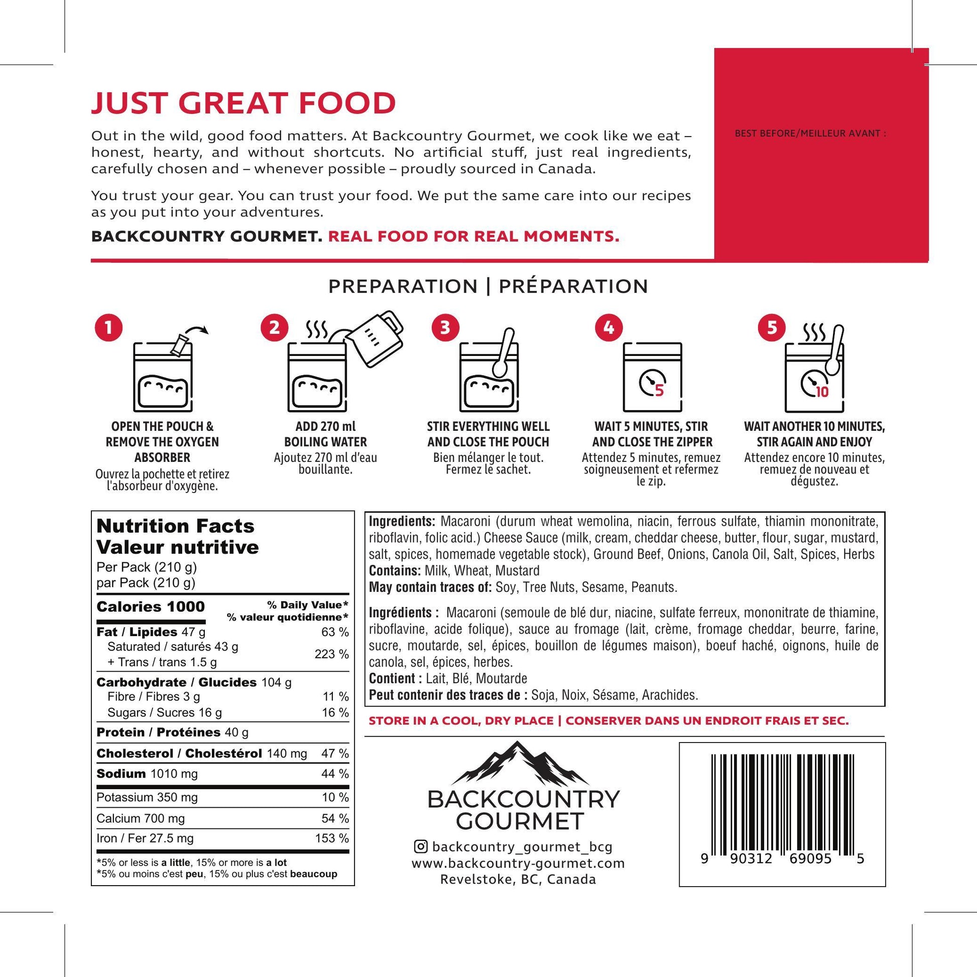 Comfort food at its best. Tender macaroni coated in a creamy cheddar cheese sauce, enriched with butter and paired with seasoned ground beef. Bold, hearty, and satisfying – perfect for your next adventure or an easy meal at home.